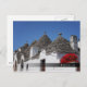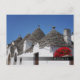 Postcard with red geranium flowers and a row of conical shaped traditional trulli houses with stone roofs in a street in Alberobello town in Puglia, Southern Italy with a fading bar and the text 'Puglia'.
