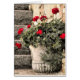 A large stone vase was filled with geraniums and placed on a flight of outdoor steps.