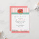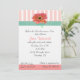 Pretty bridal shower invitation, done in white, with peach and white stripes at the top edged with a teal and white gingham ribbon. Graphics of a pretty peach coloured Gerber daisy and a peach coloured stripe on the bottom adds a nice accent touch. Text in dark grey and peach is ready to personalise for your party.