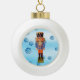 A traditional German wood nutcracker depicting a military officer with a blue and orange uniform. The nutcracker is superimposed on a blue background image with snowflakes.