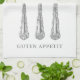 An oversized vintage illustration of a fork, knife, and spoon, on a large kitchen towel that says, 'Guten Appetit,' German for bon appetit.