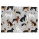 Cute German Shepherds in black and tan, black and red, black and silver, white and back colour coats sit and stand with scattered dog bones and paw prints on a light grey background.