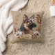 A beautiful portrait of a majestic German Shepherd dog is placed at the centre of an autumn wreath in tones of cinnamon brown, tan, and cream. The dog and wreath design is placed on a lighter brown background. Both sides of the pillow have the same image, but the reverse side has a darker brown background.