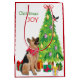 On each side of this Holiday gift bag, a German Shepherd Dog wears a red scarf while he watches a bullfinch bird land on the Christmas tree. Around the dog brightly wrapped gift packages are scattered about. The red and green text says "Christmas JOY".