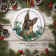 On the front of this Holiday ornament is a beautiful portrait of a German Shepherd Dog peeking out of a holly and evergreen bough. Red berries and pine cones decorate the holly and pine sprigs. The image is placed on a white circle within a thin red line circle. The back of the ornament has the same evergreen bough wreath and circle with your custom text in red.