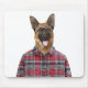 A German Shepherd is wearing glasses and a plaid shirt.
