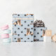 An image of a German Shepherd Dog is the feature in the pattern on this all occasion gift wrapping paper. The dog wears a blue bow tie amid a pattern of black paw prints, and is repeated on a silver blue background.