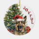 On the front of this Holiday ornament is the image of a beautiful German Shepherd Dog wearing a red and white Santa hat. The dog pops up in front of a decorated Holiday tree, and is wrapped in a string of festive lights. Red text at the side says "JOYFUL". On the back, red and green text says MERRY CHRISTMAS", and there are additional text fields for you to customise. Make it say whatever you'd like!