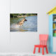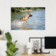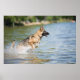 An excited German shepherd dog leaps into water outdoors on a sunny day.