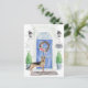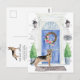 Announce your new address with our stylish announcement featuring a German Shepherd, blue front door, welcome mat, slate sign, topiaries and a floral wreath set on a grey brick background.