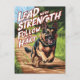 A German Shepherd dog runs down a dirt path, kicking up dust with its powerful paws. Above the dog are the words Lead With Strength, Follow With Heart.