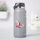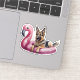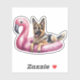 This sticker features a watercolor portrait of a german shepherd dog sitting on a pink flamingo pool floatie.