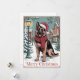 Colorful and joyful Christmas design with a German Shepherd wearing a Santa hat.