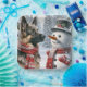 A German Shepherd wearing a red and white scarf stands beside a snowman with a top hat amidst a snowy landscape