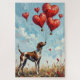 This energetic scratchboard illustration captures a single GSP frozen in a pointing stance, aiming its nose directly at a cluster of luminous, ruby-red heart-shaped hot air balloons. A unique Valentine's Day gift for Pointer owners.