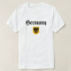 "Germany" type and crest. The word GERMANY is set in a stylised typeface in black and set in an arc over an image of the German coat of arms. The coat of arms of Germany displays a black eagle on a yellow shield (Or, an eagle displayed sable). It is a re-introduction of the coat of arms of the Weimar Republic (in use 1919–1935) and adopted by the Federal Republic of Germany in 1950. The current official design is by Tobias Schwab (1887–1967) and was introduced in 1928.