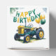 Celebrate in style with this charming watercolor illustration featuring a vibrant yellow and green tractor resting in a grassy field adorned with colourful flowers. A festive green and yellow banner proudly displays “Happy Birthday,” while matching balloons add to the cheerful atmosphere. In the background, a rustic building completes this delightful country-inspired scene, perfect for a farm-themed birthday celebration!