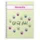 A personalised notebook for a keen baker. Type in the box to enter the required name or other text in deep pink. The design features an array of colourful cupcakes with the caption "Get Set Bake!" The background is a pale lime green colour.