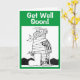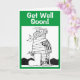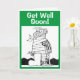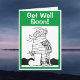 Get well soon funny cartoon card. Create your own inside message. Get well soon after an accident. Man in pyjamas has a broken leg and is wrapped in bandages as well as being on crutches. Green background.