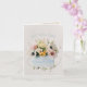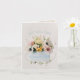 This beautiful Get Well card features a photo of a medical mask with a sweet bouquet of white and pink poppies and ranunculus blooms. Above the bouquet in curved blue text it says "Get Well Soon" in capital letters. The inside of the card has a light blue watercolor background on the left and an aged cream watercolor background on the right.