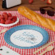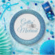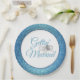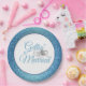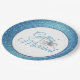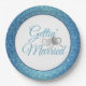 Party paper plate shown in a lovely Blue fine glitter print around the rim and White centre. Gettin' Married in a fancy script in centre with two interlinked hearts.