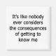 For the sarcasm lover in all of us. Check out this witty “It’s Like Nobody Ever Considers the Consequences of Getting To Know Me” design on apparel and gifts.