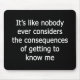 For the sarcasm lover in all of us.  Check out this witty “It’s Like Nobody Ever Considers the Consequences of Getting To Know Me” design on apparel and gifts.