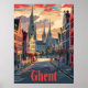 Experience the magical transformation of Ghent as the sun sets with our travel ad illustration. This enchanting piece captures the city's historic skyline aglow in the warm hues of sunset. Picture yourself along the picturesque canals, where ancient architecture reflects the golden light, and the city comes alive with a tranquil, timeless beauty. Embark on a journey to Ghent, where every evening unfolds in a symphony of colours and historic horizons.