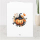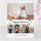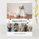 Happy Halloween card featuring a photo collage with paw prints on the front, a skeleton ghost with a jack-o'-lantern inside, and a pumpkin wearing a black witch hat and adorned with orange flowers at the back. Easily personalise this cute Halloween card with your family name and text.