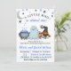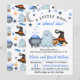 This baby shower invitation features a playful Halloween theme. A smiling blue ghost stands next to a bubbling cauldron, holding a pumpkin basket filled with candy. A witch's hat, candy corn, and a crescent moon with stars complete the scene, adding charm to this cute and spooky design.