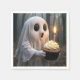 A ghostly figure stands in a misty forest, holding a cupcake adorned with a single lit birthday candle