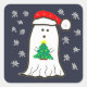 Cute ghost holding a Christmas tree and wearing a Santa hat with snowflakes in the background