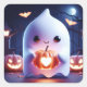 A charming, cartoon ghost stands in the centre of the image, illuminated by the warm glow of a heart-carved pumpkin it holds. The ghost, with its round, blushing cheeks and wide, innocent eyes, exudes a friendly and adorable aura, contrasting the spooky backdrop of a moonlit graveyard. Bats flit across the background, and jack-o'-lanterns with menacing grins flank the ghost, adding a touch of classic Halloween ambiance.