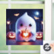 A charming, cartoon ghost stands in the centre of the image, illuminated by the warm glow of a heart-carved pumpkin it holds. The ghost, with its round, blushing cheeks and wide, innocent eyes, exudes a friendly and adorable aura, contrasting the spooky backdrop of a moonlit graveyard. Bats flit across the background, and jack-o'-lanterns with menacing grins flank the ghost, adding a touch of classic Halloween ambiance.