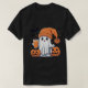 t-shirt with a cute ghost in an orange beanie holds a glass of orange juice while standing next to two smiling jack-o'-lanterns. Bats and tiny hearts float in the background, creating a playful Halloween vibe.