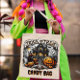 On a whimsical Halloween night, a witch stands by a haunted house adorned with glowing pumpkins and playful ghosts, creating a magical and eerie atmosphere for trick-or-treaters.