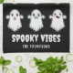Destei's illustrations of cute ghost characters with different kind of face expression. There is also text that reads: "Spooky vibes" together with a personalizable text area for a family name or other custom text. The background colour is black, but it can be changed to any other colour, if so wished.