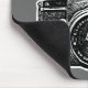 A Mouse pad with a high contrast, high passed filtered and vectorised image of a vintage East German camera from the 1950s. Creating a strong bold toothy retro screen print. or mediaeval Gothic brass rubbing like effect.
