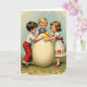 This design shows three young children gathered closely around an enormous pale ivory egg that fills most of the scene, its smooth surface catching a soft glow. Two boys and a girl circle it with careful hands, and their leaning shoulders and shy smiles suggest a shared secret between close friends. On the left, a boy in a white shirt and red trousers watches the egg with focused curiosity, his dark shoes set neatly in the grass. In the middle, a blond boy wearing a sailor-style collar looks on with a gentle, affectionate gaze, as if waiting for the others to react first. On the right, a girl in a white dress with red floral stitching and a deep red sash holds a small yellow toy duck 🐰 and reaches it toward the egg like a friendly introduction. Above the illustration, a short Easter greeting appears in small red lettering, centered near the top, while the rest of the space stays open and airy. The background shows a pale blue sky with light clouds over green grass sprinkled with tiny golden bits, with a white ribbon in the girl’s hair and a few small 🌷 details near the lower edge.