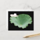 Large green lotus leaf accompanied by a bloom, isolated on black.