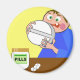 A hard pill to swallow. Cute cartoon graphic illustration of a man trying to swallow his medication but the tablet is too big. Image available on various gifts and products. Magnets.