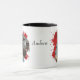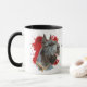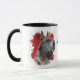 A beautiful water colour portrait of a Giant Schnauzer stands out against a bright red abstract paint splatter background. The image is on two sides of the mug, with your name or other custom text in black between them.