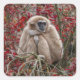 A white-handed gibbon perches gracefully in a tree adorned with vibrant red leaves. With a serene expression, it gazes into the distance, its agile form blending harmoniously with the natural surroundings
