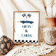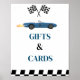 Sign for a child's second birthday party with a racing car motif and a depiction of a blue automobile with flames. "Speed limit 2," according to the paragraph.
