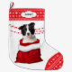 The front of this Holiday stocking shows an image of an adorable black and white Border Collie puppy peeking out of a red and white Santa style gift bag. Behind the dog is a red beaded garland. The toe and top border are a red and white snowflake pattern. On the top border is a white label with your custom text in dark grey. The back of the stocking is the same red and white snowflake pattern.