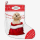The front of this Holiday stocking shows an image of an adorable buff Cocker Spaniel dog peeking out of a red and white Santa style gift bag. Behind the dog is a red beaded garland. The toe and top border are a red and white snowflake pattern. On the top border is a white label with your custom text in dark grey. The back of the stocking is the same red and white snowflake pattern.