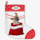 The front of this Holiday stocking shows an image of an adorable brown Chihuahua puppy peeking out of a red and white Santa style gift bag. Behind the dog is a red beaded garland. The toe and top border are a red and white snowflake pattern. On the top border is a white label with your custom text in dark grey. The back of the stocking is the same red and white snowflake pattern.