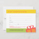 These colourful gift certificates will put a smile on anyone's face. Various dancing gift boxes are cheerful and appropriate for any type of gift giving occasions. This easily customisable template allows you to put your business logo front and centre. Just fill out your business name, address and your certificate conditions at the bottom. These custom gift cards help out your busy customers during holiday seasons. Having your name and logo pre-printed reinforce your business brand. These gift certificate cards comes with white envelopes.
