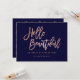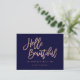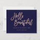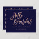 A modern, stylish gift certificate hello beautiful business card with modern hand lettering style brush typography in faux rose gold foil on a trendy and elegant navy blue background. If you need any customisation, don't hesitate in contacting me