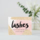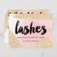 A modern, stylish gift certificate beauty artist lashes business card with modern hand lettering style brush typography on a trendy and elegant gold glitter sparkles brushstrokes and pastel pink watercolor.